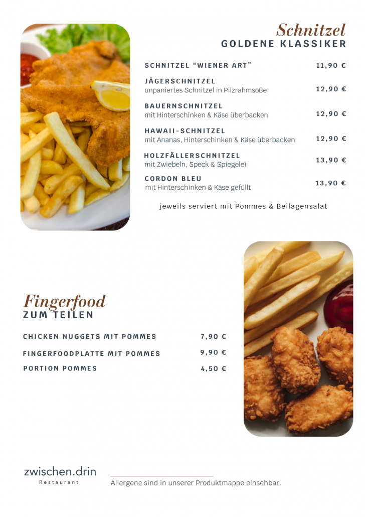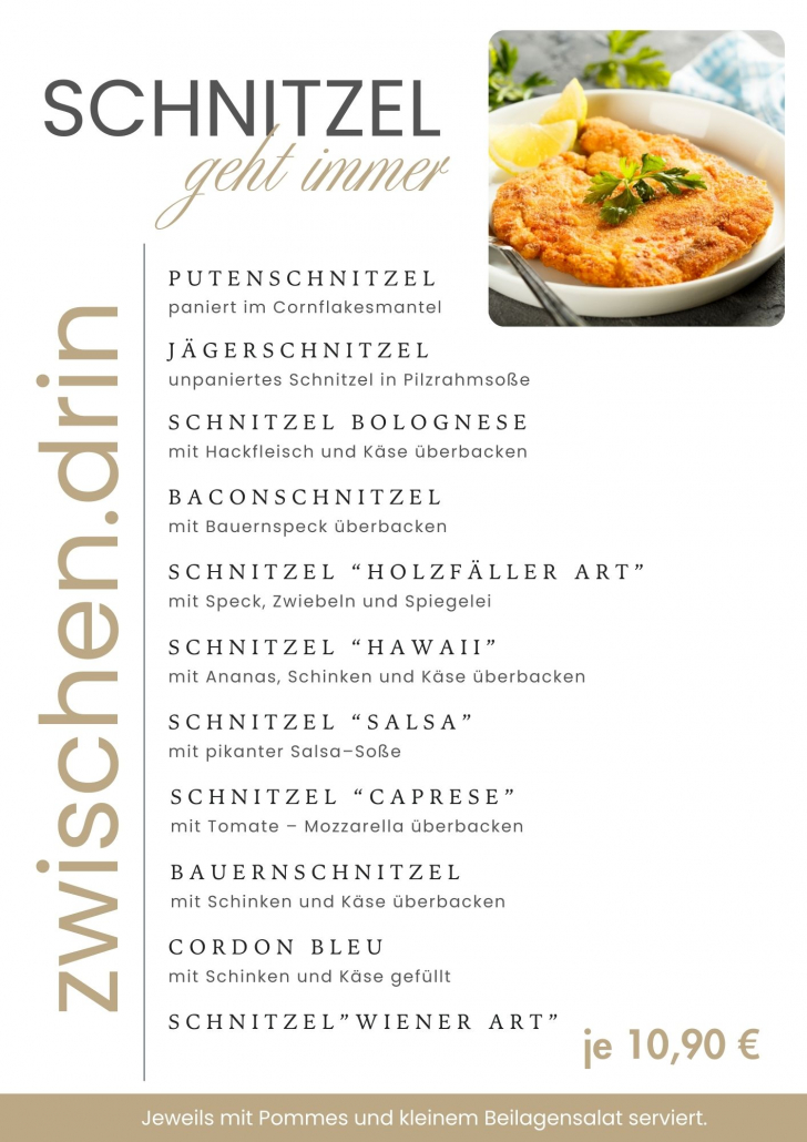 Knusprig, goldbraun und frisch zubereitet. Jeden Dienstag servieren wir unsere Schnitzel-Klassiker. Ob traditionell oder mit feiner Beilage: Perfekt für den kleinen Hunger oder den großen Appetit.
