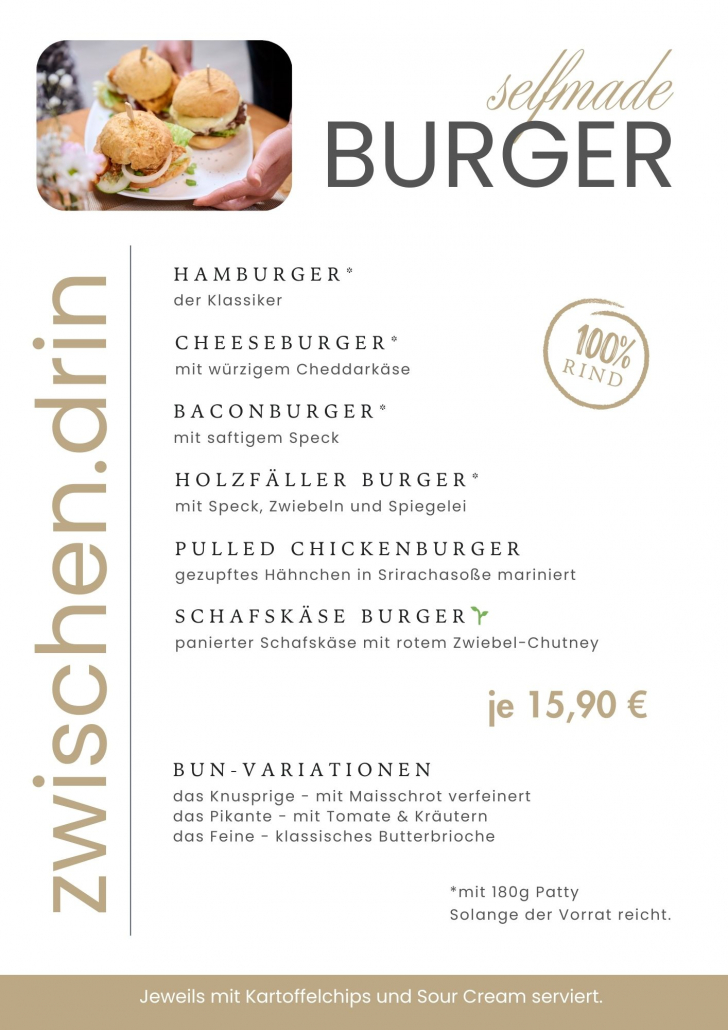 Saftig, hausgemacht und voll im Geschmack. Am Donnerstag dreht sich alles um unsere Burger. Frische Zutaten, hausgemachte Buns und kreative Toppings machen jeden Biss zum Highlight.